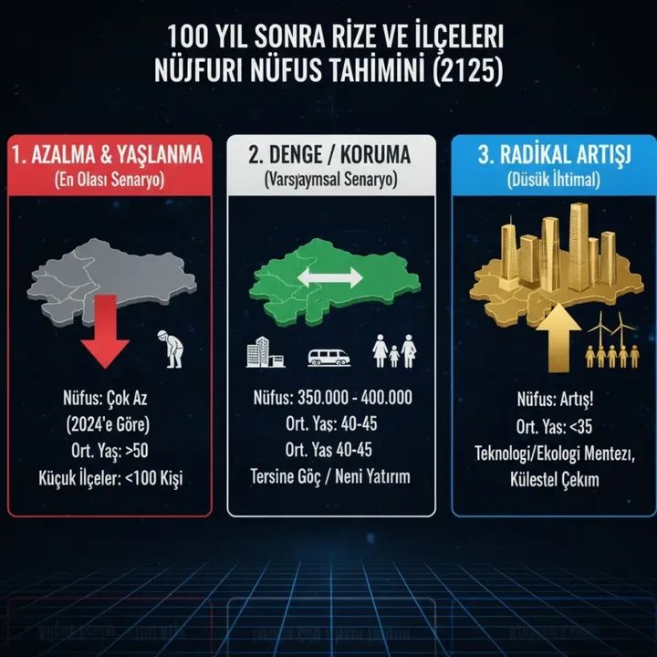 Mevcut veriler ve eğilimler göz önüne alındığında, Rize’nin 100 yıl sonraki nüfusu için en olası senaryolar şunlardır: