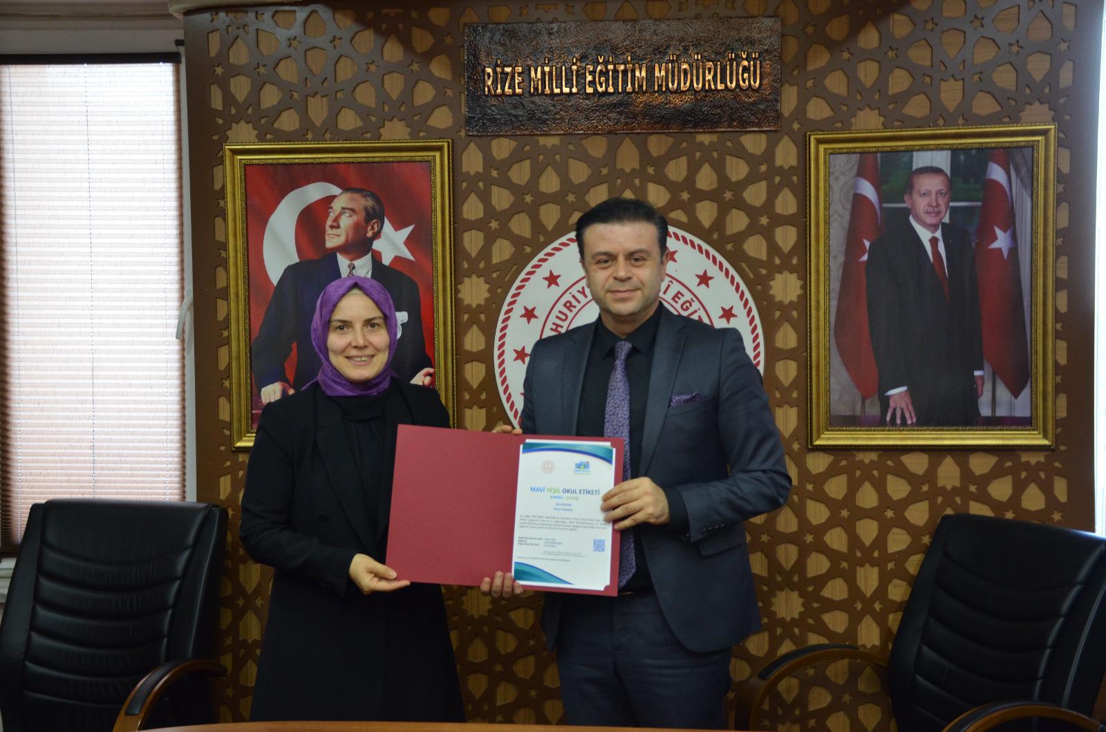 Rize İl Millî Eğitim Müdürü Halil İbrahim Akmeşe, belge almaya hak kazanan okulları ziyaret ederek Mavi Yeşil Belgelendirme belgelerini okul yönetimlerine takdim etti.
