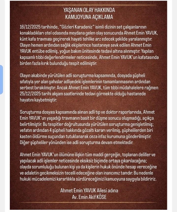 Olay sonrası başlatılan adli soruşturma kapsamında şüpheli sıfatıyla dosyada yer alan bazı kişilerin, ilk aşamada adli işlemlerinin ardından serbest bırakıldığı belirtilen açıklamada, Ahmet Emin Yavuk’un tüm tıbbi müdahalelere rağmen 25 Aralık 2025 akşam saatlerinde tedavi gördüğü hastanede yaşamını yitirdiği bildirildi.