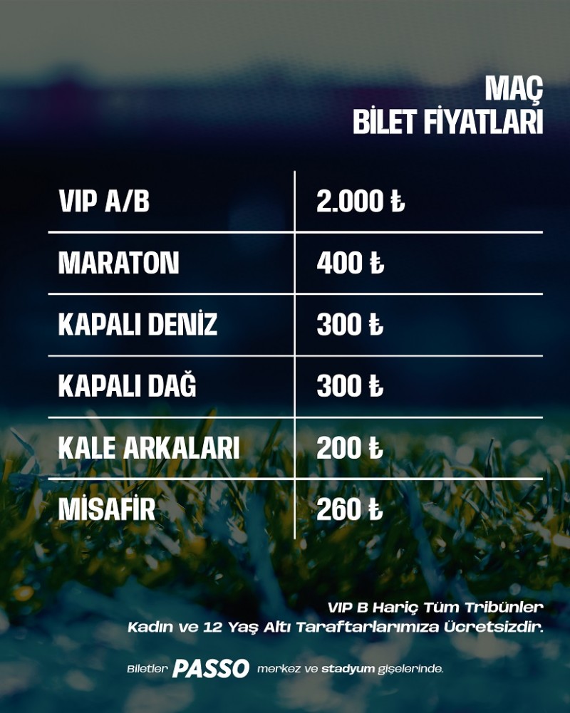 13 Nisan 2026 Pazartesi günü saat 20.00’de Çaykur Didi Stadı’nda oynanacak mücadele öncesinde taraftarlar için bilet fiyatları da açıklandı.