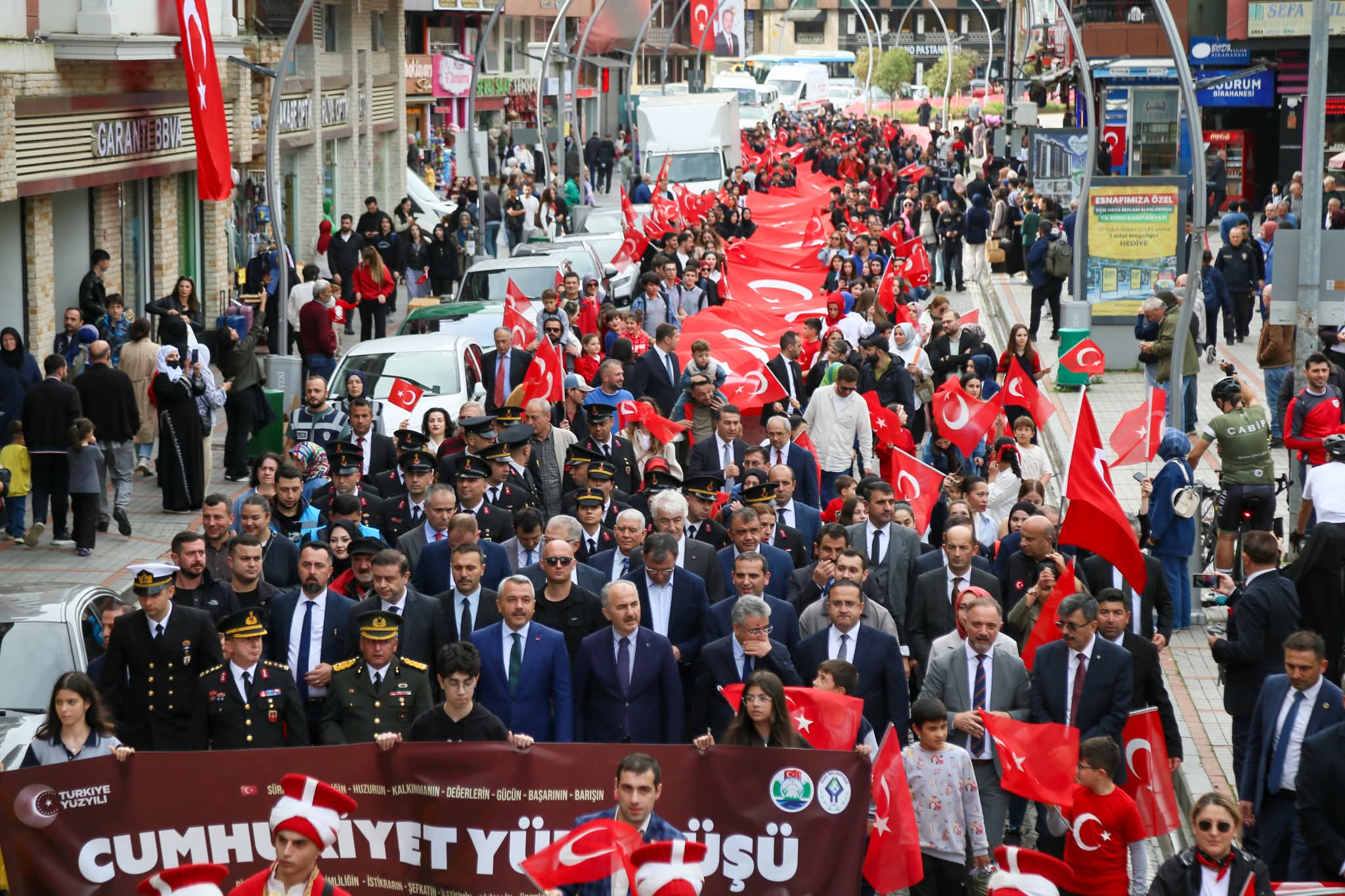 Cumhuriyet’in 102. yıl dönümü kutlamaları kapsamında, 100 metrelik dev Türk Bayrağı eşliğinde kortej yürüyüşü gerçekleştirildi.