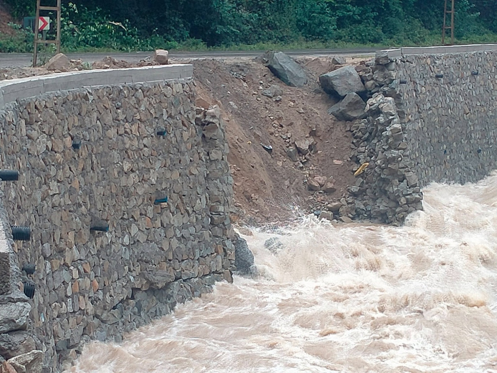 İkizdere ilçe girişinde DSİ tarafından dere taşkınından korunmak için yapılan taş duvarlar geçen hafta meydana gelen taşkında yer yer yıkıldı.