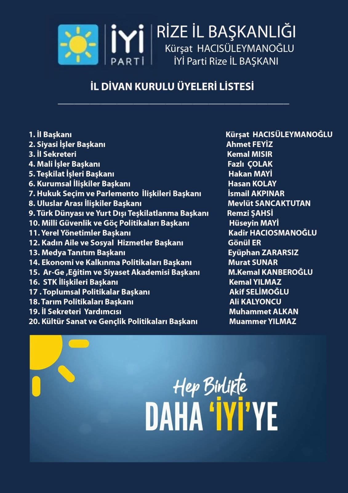 Yeni divanda dikkat çeken isimler arasında, Tek Gıda-İş Sendikası Rize Bölge eski Başkanı Ahmet Feyiz ile iş insanı Hakan Mayi yer aldı. İlk kez İYİ Parti yönetiminde görev alan Ahmet Feyiz Siyasi İşler Başkanı, Hakan Mayi ise Teşkilat İşleri Başkanı oldu.