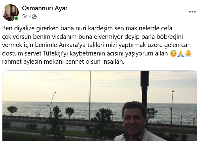 “Ben diyalize girerken bana ‘Nuri kardeşim sen makinelerde cefa çekiyorsun, benim vicdanım buna elvermiyor’ deyip bana böbreğini vermek için benimle Ankara’ya tahlillerimizi yaptırmaya gelen can dostum Servet Tüfekçi’yi kaybetmenin acısını yaşıyorum. Allah rahmet eylesin, mekânı cennet olsun inşallah.”