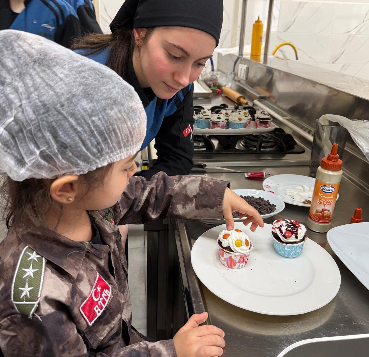 Minikler bir taraftan pasta yaparken bir taraftan da lise öğrencileri ve öğretmenlerinden hijyen, mutfaklarda ve hayatın farklı mekanlarında acil durum tedbirleri ve ilk yardım gibi hayati konularda bilgi aldılar.