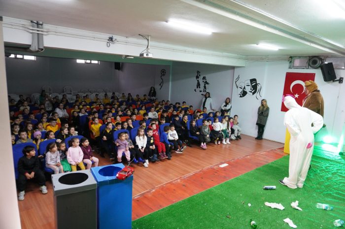 Öğrencilerde çevre bilinci oluşturmak, geri dönüşümün ve sıfır atık uygulamalarının önemine dikkat çekmek amacıyla sahnelenen tiyatro gösterisi, minik izleyiciler tarafından büyük ilgiyle karşılandı. Eğitici ve eğlenceli içeriğiyle dikkat çeken gösteride; atıkların doğru ayrıştırılması, geri dönüşümün doğaya ve geleceğe katkıları interaktif bir anlatımla aktarıldı.