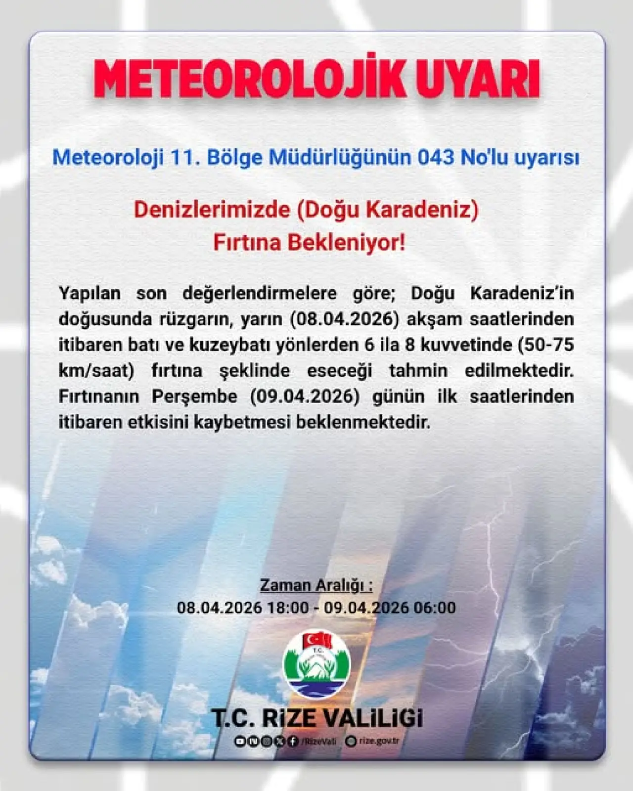 Rize Valiliği tarafından yapılan açıklamada, Meteoroloji 11. Bölge Müdürlüğü’nün 043 numaralı uyarısına dikkat çekildi. Açıklamaya göre Doğu Karadeniz’de denizler için fırtına uyarısı yapıldı.
