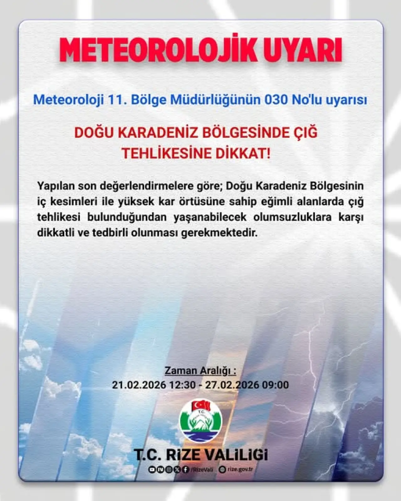 Rize Valiliği, Meteoroloji 11. Bölge Müdürlüğü tarafından yapılan 030 No’lu meteorolojik uyarı kapsamında önemli bir açıklama yayımladı. Açıklamada, Doğu Karadeniz Bölgesi’nde çığ tehlikesine karşı vatandaşların dikkatli olması gerektiği belirtildi.