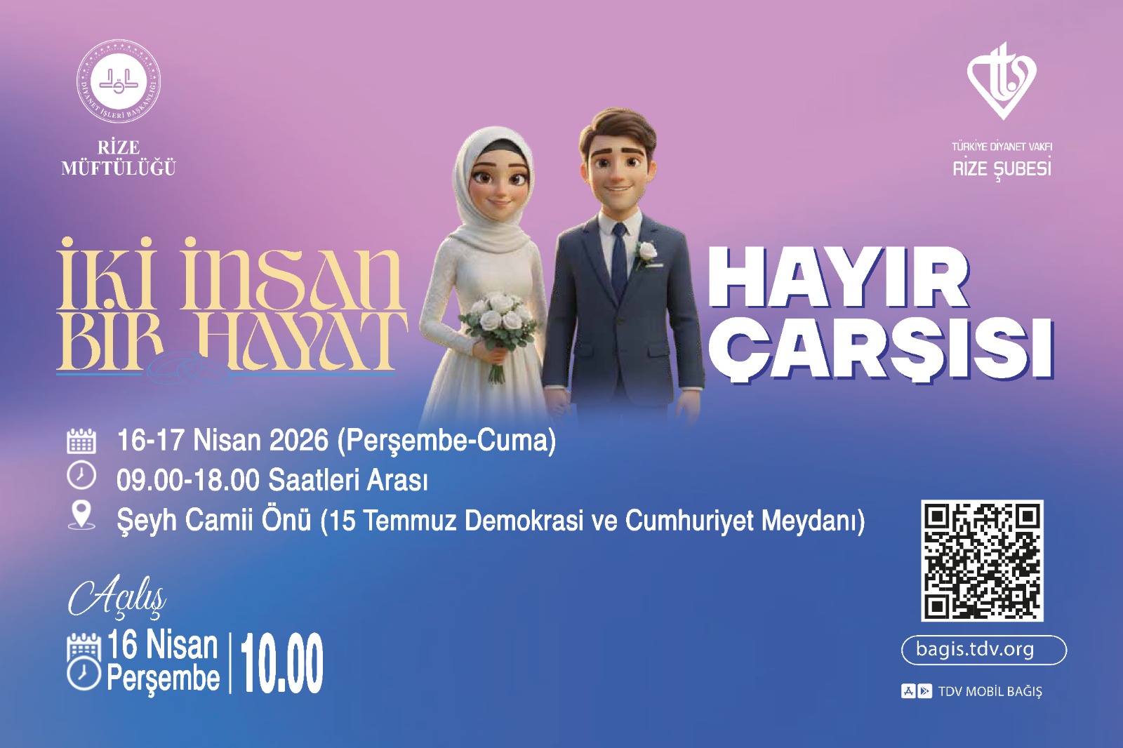 Rize İl Müftülüğü ile TDV Rize Şubesi iş birliğinde, projeye katkı sunmak amacıyla “Hayır Çarşısı” kurulacak. 16-17 Nisan 2026 tarihlerinde 15 Temmuz Demokrasi ve Cumhuriyet Meydanı’nda (Şeyh Camii önü) gerçekleştirilecek organizasyonun açılışı, 16 Nisan Perşembe günü saat 10.00’da yapılacak.