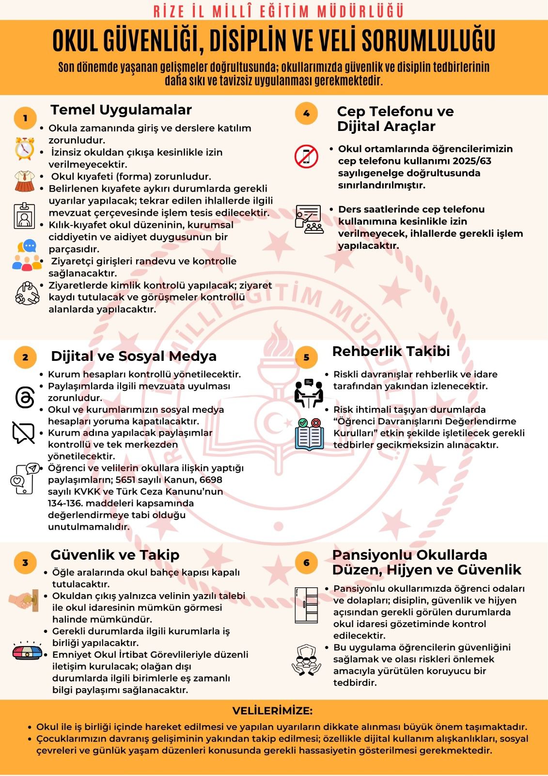 Yapılan açıklamada, okullarda uygulanacak temel kurallar net bir şekilde sıralandı. Buna göre öğrencilerin okula zamanında gelmesi ve derslere katılımı zorunlu olacak. İzinsiz okuldan çıkışlara kesinlikle izin verilmeyecek, okul kıyafeti uygulaması titizlikle sürdürülecek. Ayrıca ziyaretçi girişleri randevu ve kontrol şartına bağlanırken, öğle aralarında okul dışına çıkış yasaklanacak. Ders saatlerinde cep telefonu kullanımı da yasak kapsamında olacak.