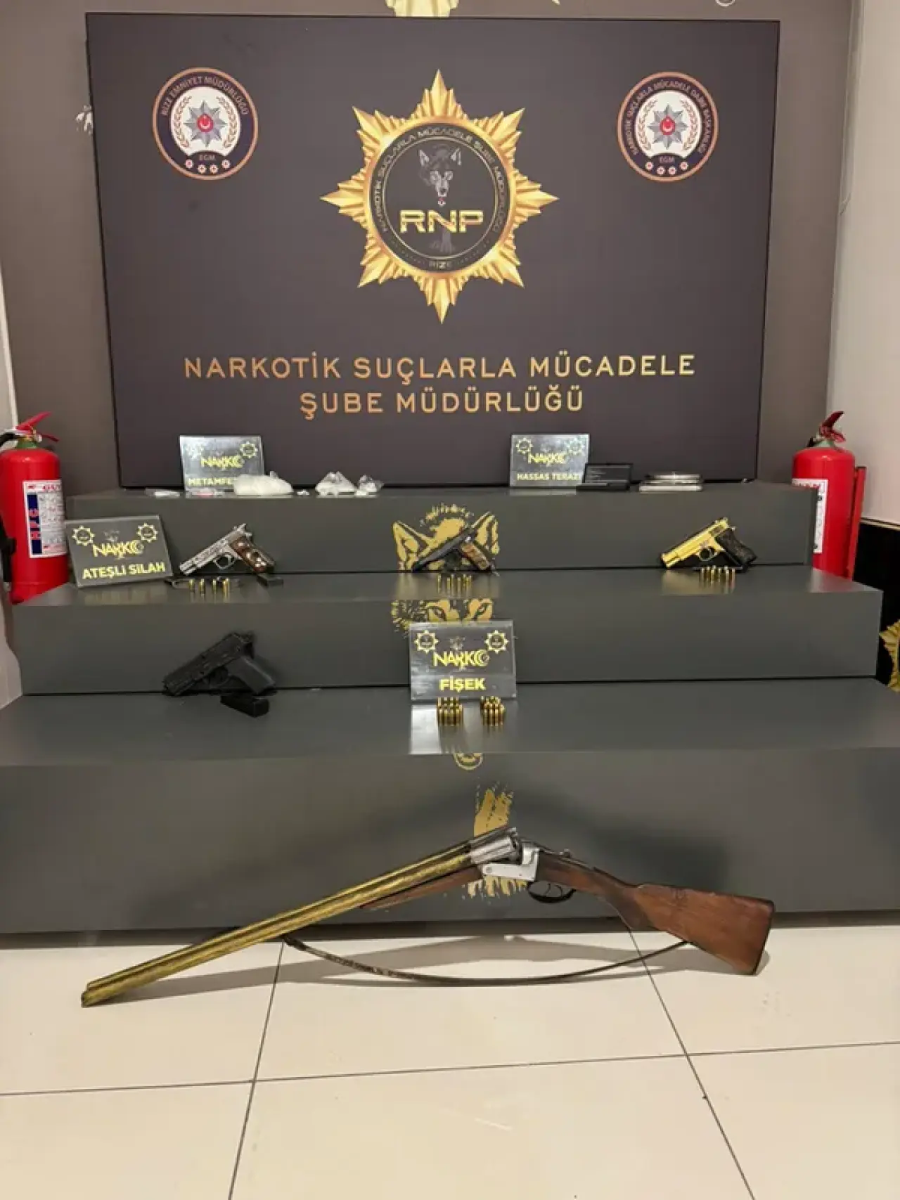 Ekipler, şüphelilerin ev, iş yeri, araç ve üzerlerinde yaptıkları aramada, 190,92 gram metamfetamin, 1,7 gram esrar, 4 ruhsatsız tabanca, 55 tabanca fişeği ve ruhsatsız tüfek ele geçirdi.