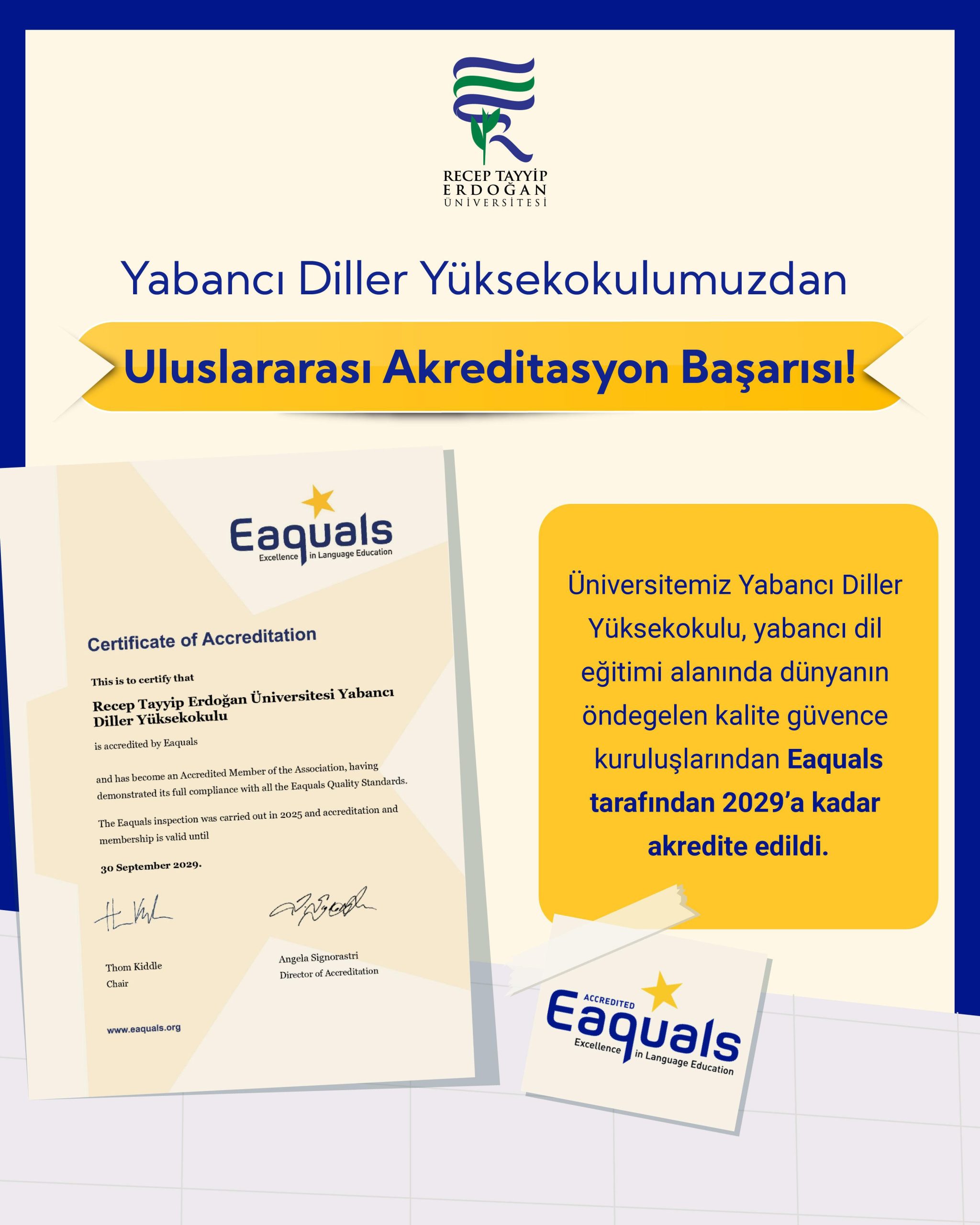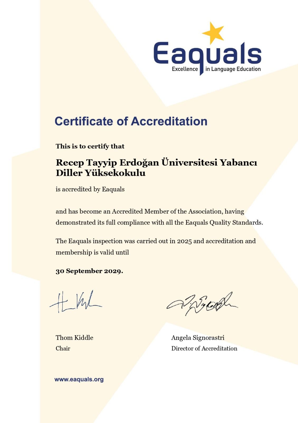 25 Ağustos 2025 tarihinde alınan karar doğrultusunda Yüksekokul, 30 Eylül 2029 tarihine kadar geçerli olmak üzere 4 yıllık süreyle Eaquals akreditasyonu kapsamına dâhil edildi. Bu başarı ile RTEÜ Yabancı Diller Yüksekokulu, Türkiye’deki devlet üniversiteleri arasında Eaquals akreditasyonu almaya hak kazanan 8. yüksekokul, tüm üniversiteler (devlet ve vakıf) arasında ise 18. yüksekokul oldu.
